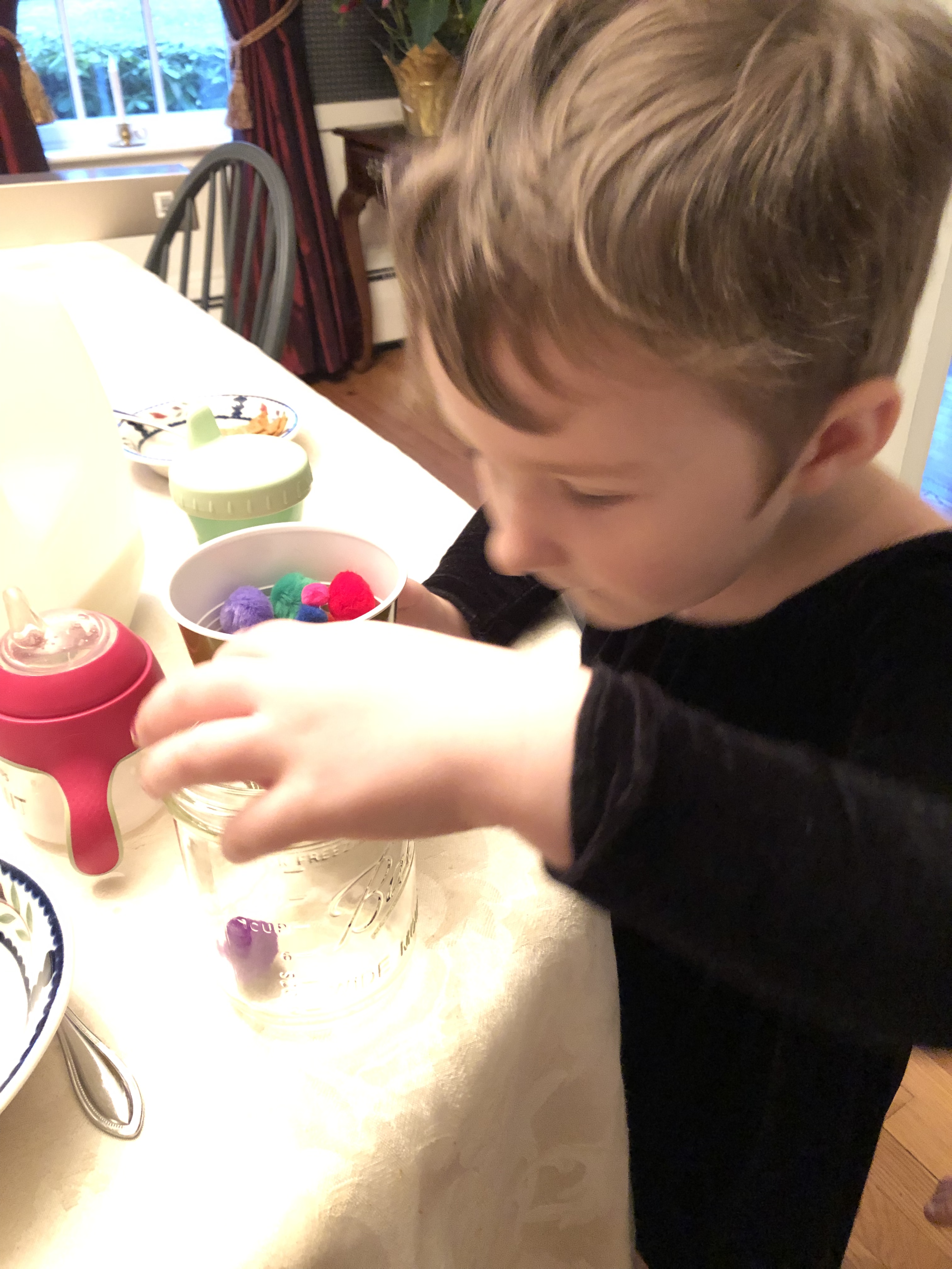 Each child took a turn holding the cereal boxes up to their eyes to look through the holes. With a box at each eye, they could see a lot of everything except the print of Christ/glory of God.